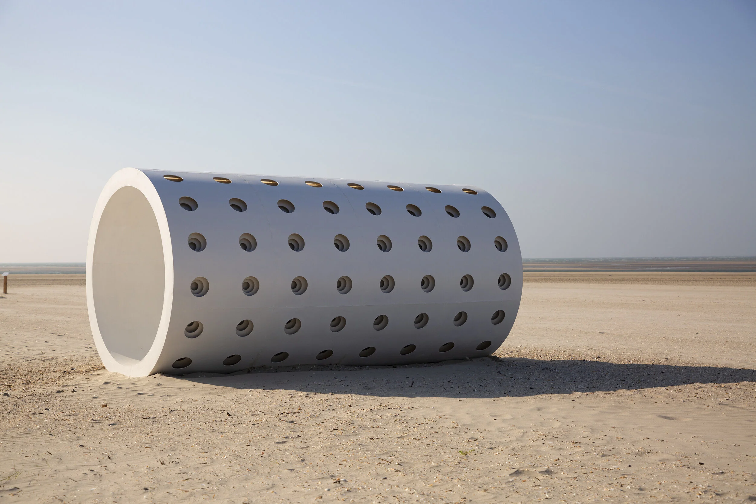 This multi layered Artworks objective is to give a depth of vision creating a characteristic structural “carving”. These characteristic signs allow the artwork to contain a similarity, proximity and continuation to the natural world. In this way the artworks cycle can be seen to symbolize the constant, repetitive cycle of the natural world upon the Wadden Sea. The artworks visual representation through the use of repetitive signs is a “code” that symbolizes the cycle of the Wadden Seas tidal waters. The perforated cylindrical structure of the sculpture emphases the experience of “Cyclus”, when experienced in connection with the constant, swell and surging of the sea and winds. In this way, the cylindrical structure can be seen to resemble a filter, reminding us that we have a responsibility to refrain from polluting our oceans.